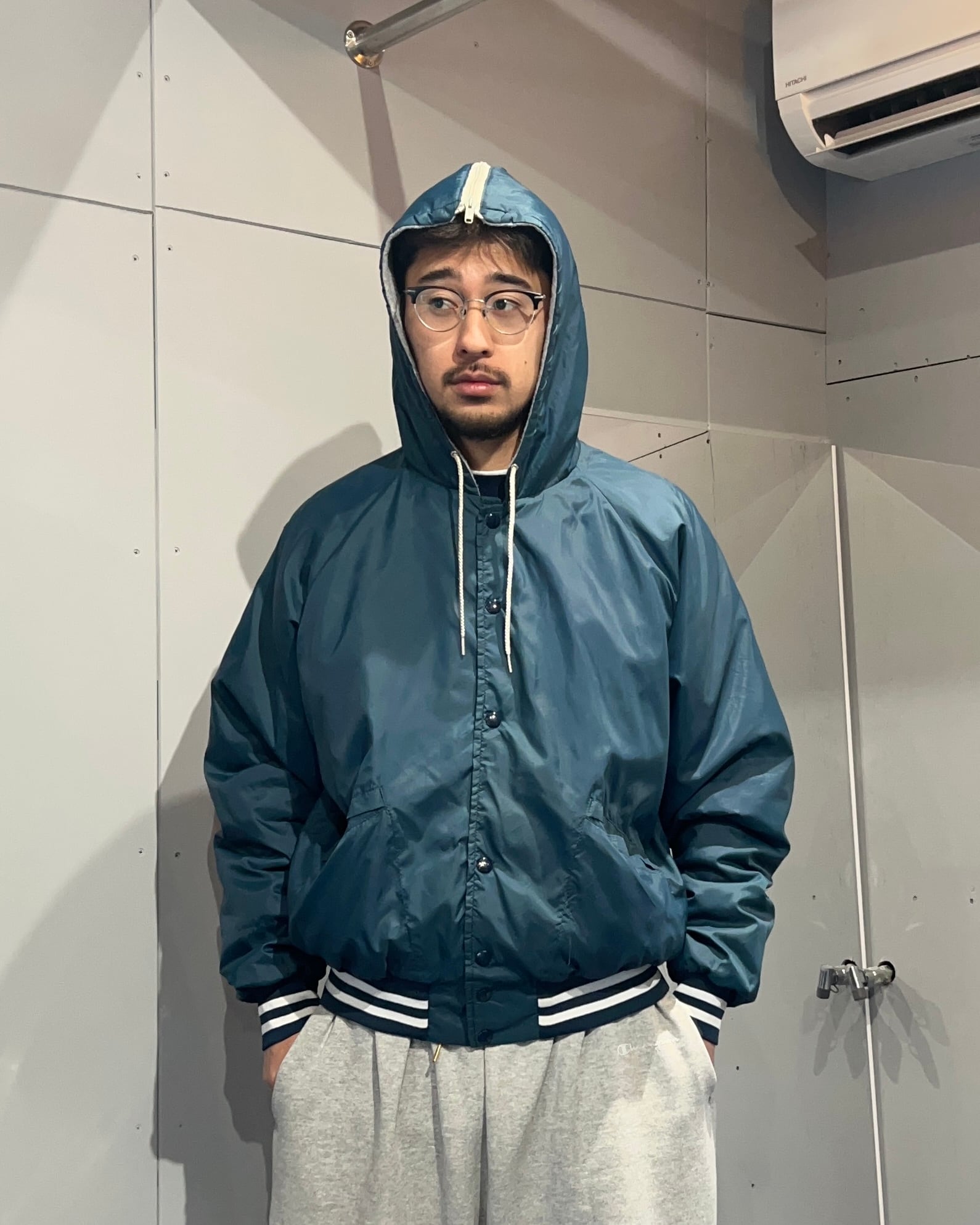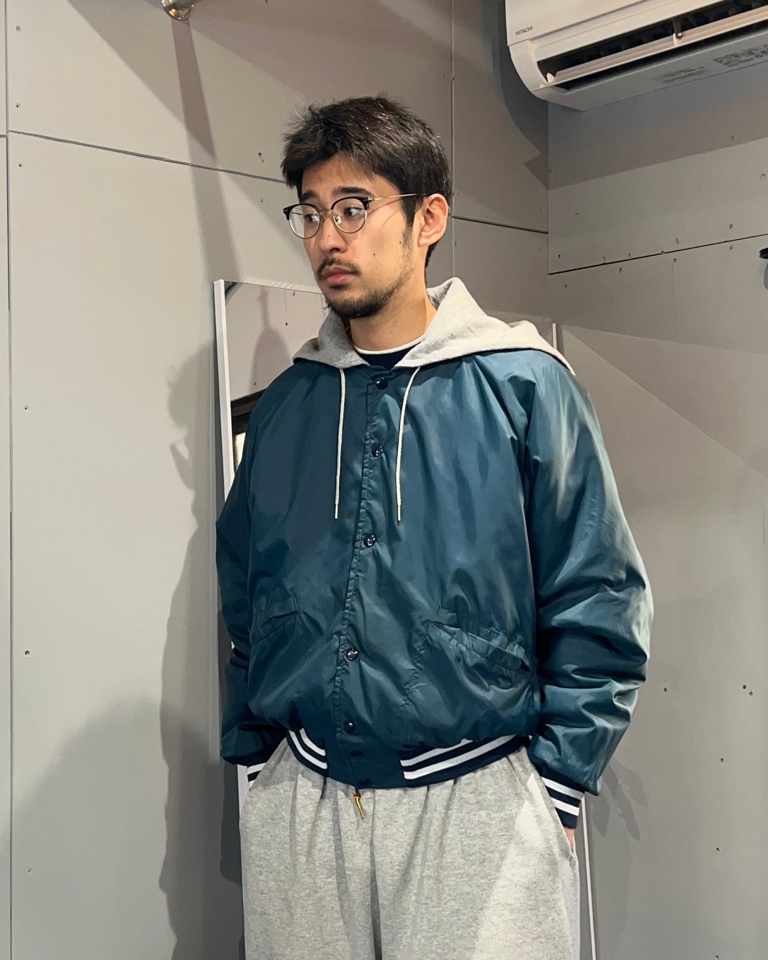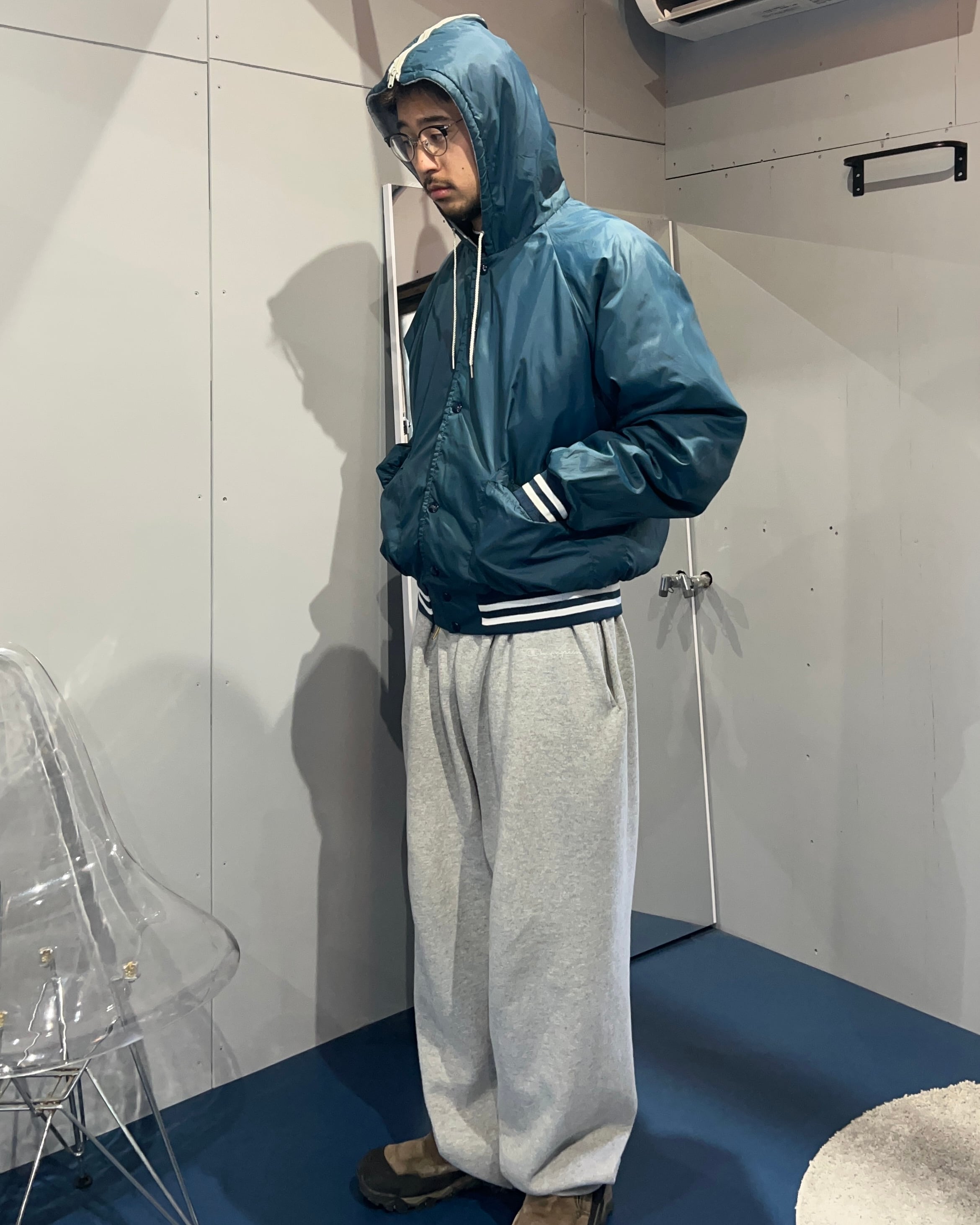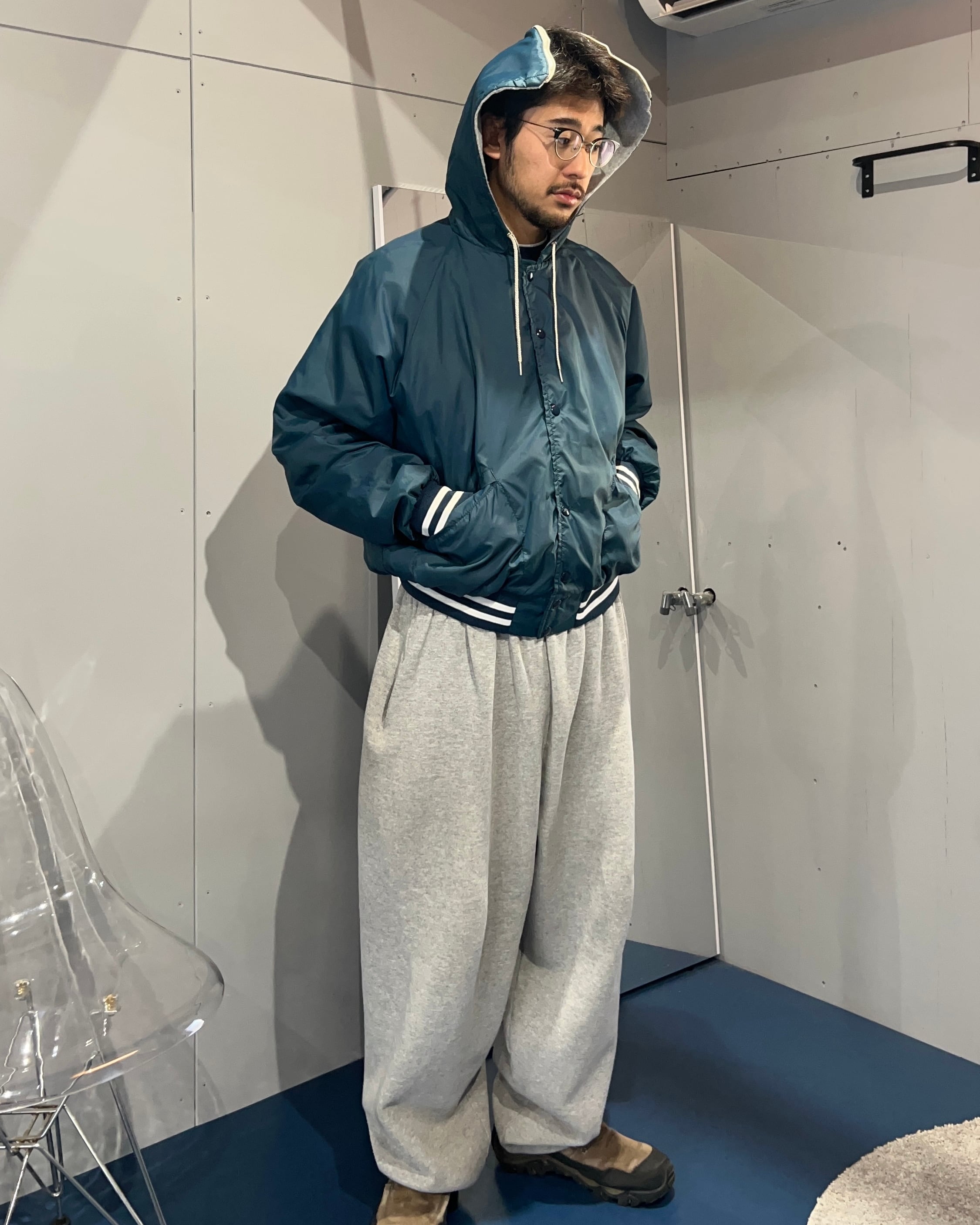 スタジャンぽさもありつつ、けどフードが付いてて、それが割けるっていう